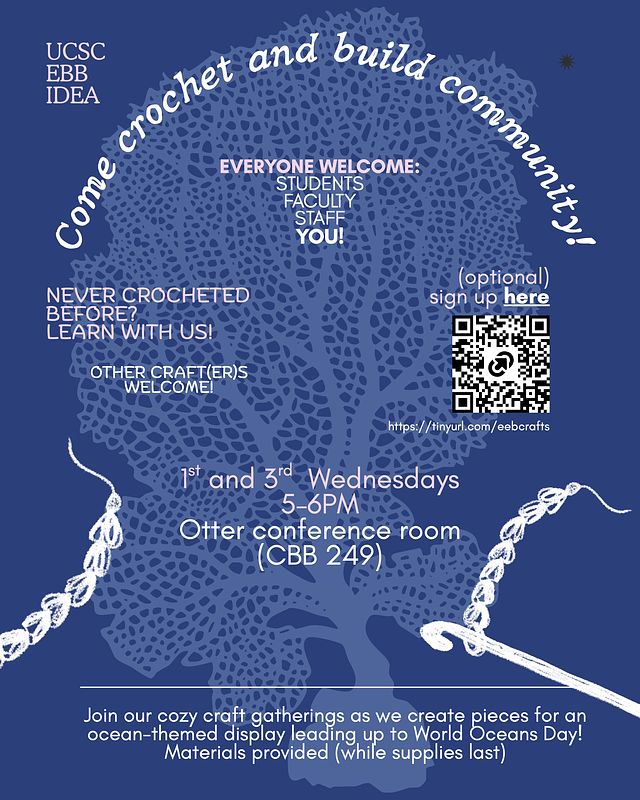 As a member of the UCSC EEB IDEA Committee, I've organized a crafting circle and crochet club that is bringing the department together to create an ocean-themed marine display for World Ocean Day. Here, I aim to cultivate a more connected and inclusive departmental community.